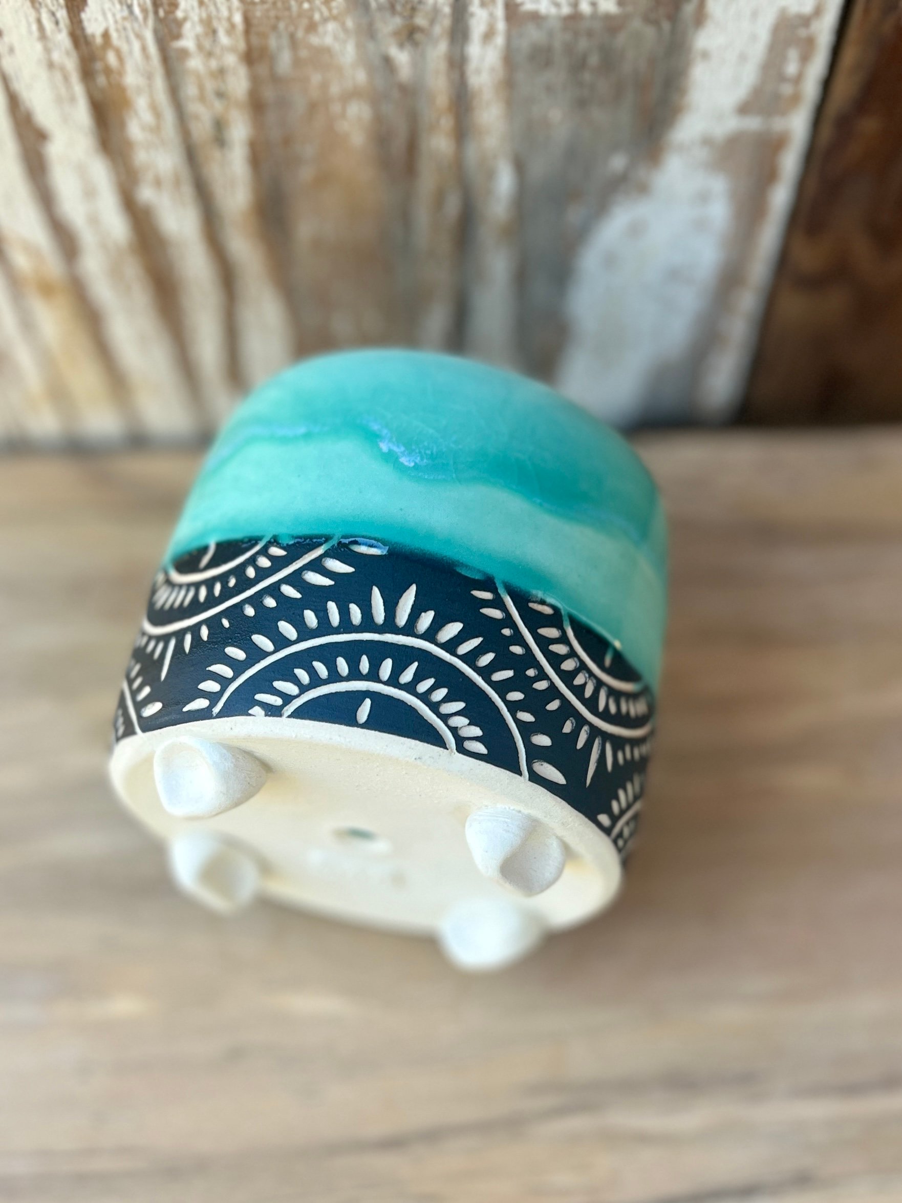 Brighten up your space with this cheery planter. It has sturdy little feat, a small drainage hole and a hand carved design that wraps all around the planter. Perfect for succulents or small plants.