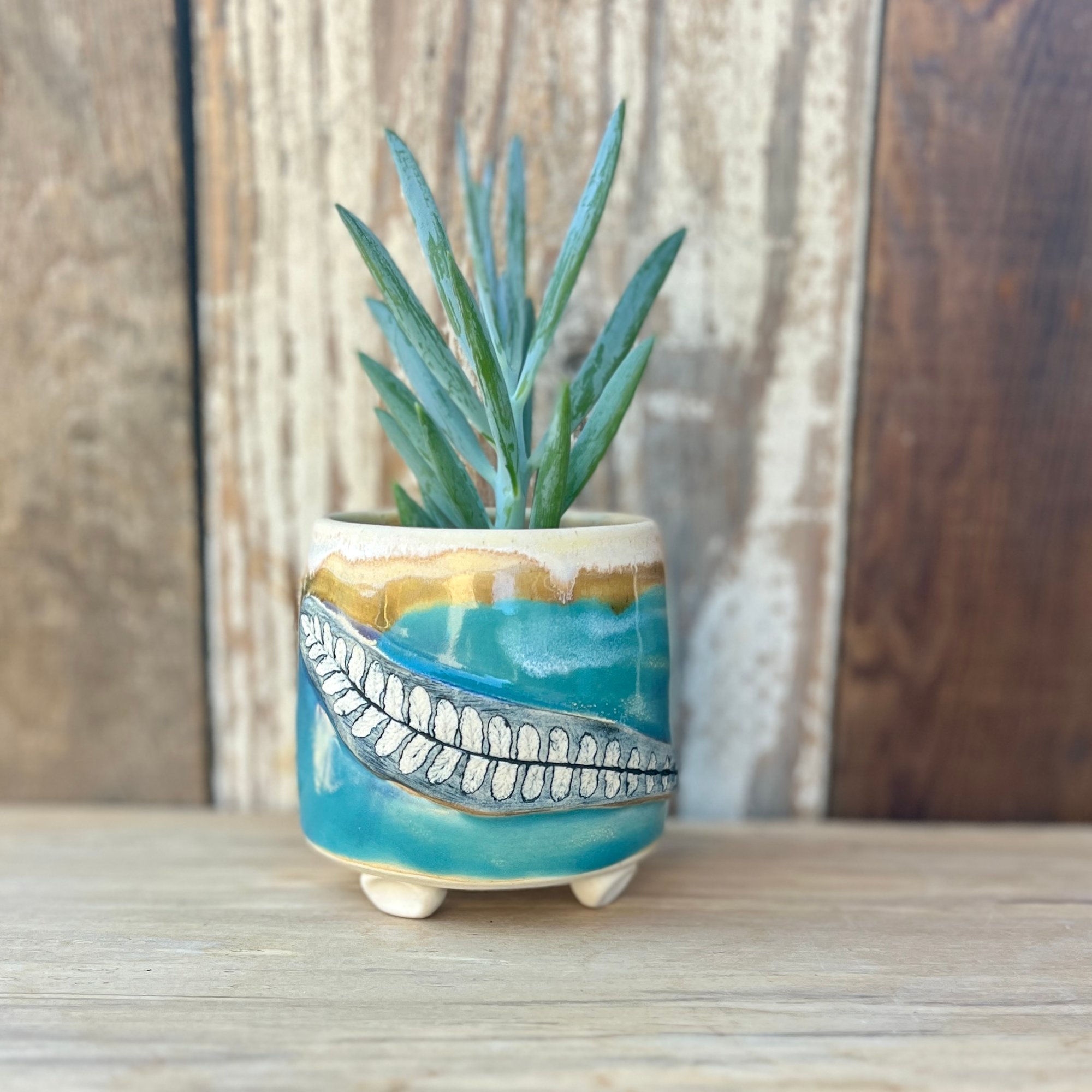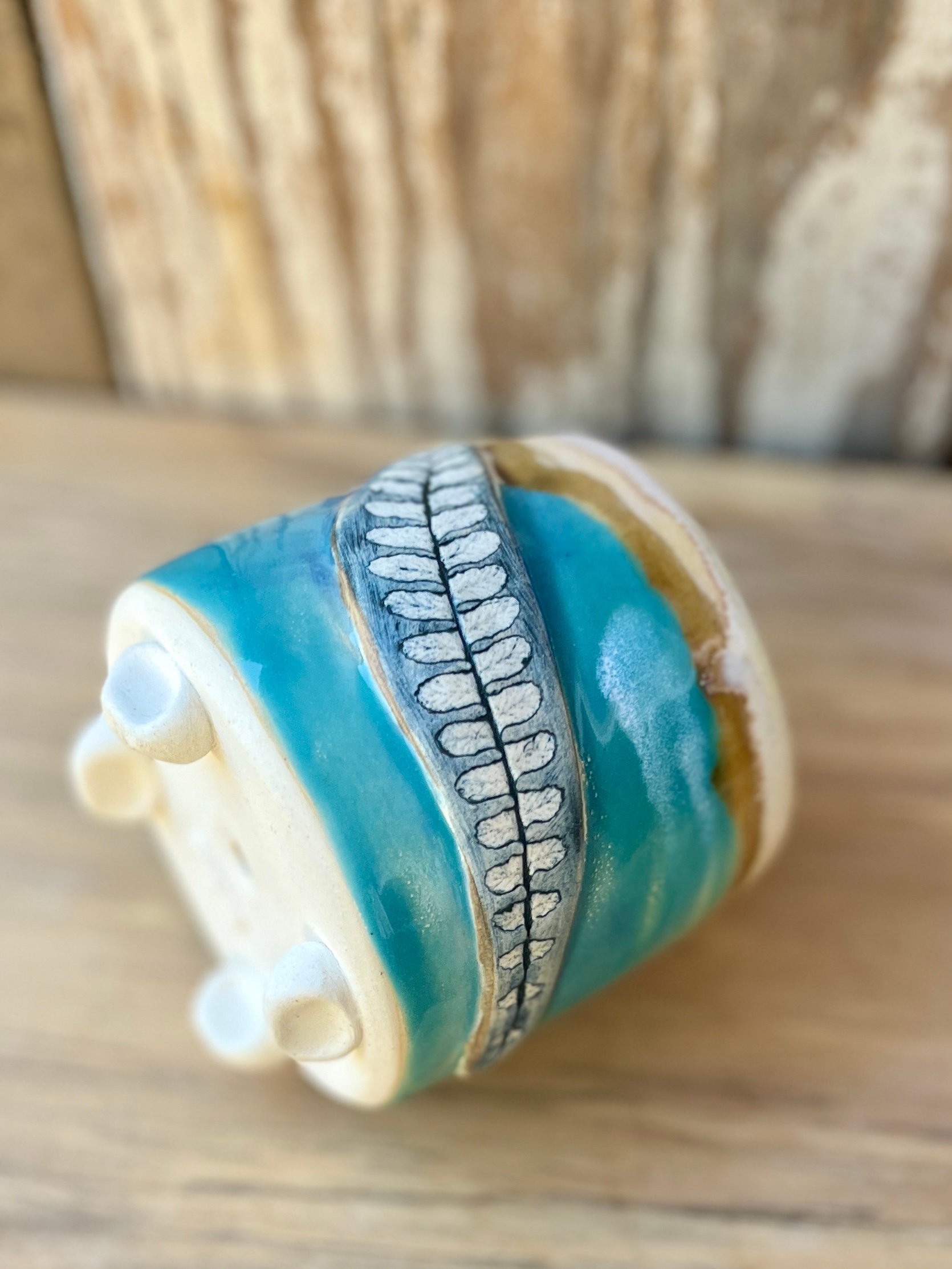 This planter was thrown on the wheel and painted by me. The fern detail was created by pressing a fern into the clay and adding an oxide wash for the color. The planter has 3 colors of glaze that dance beautifully together. It includes a small drainage hole and 4 delicate feet.