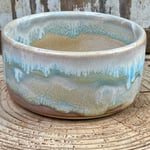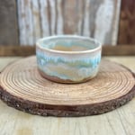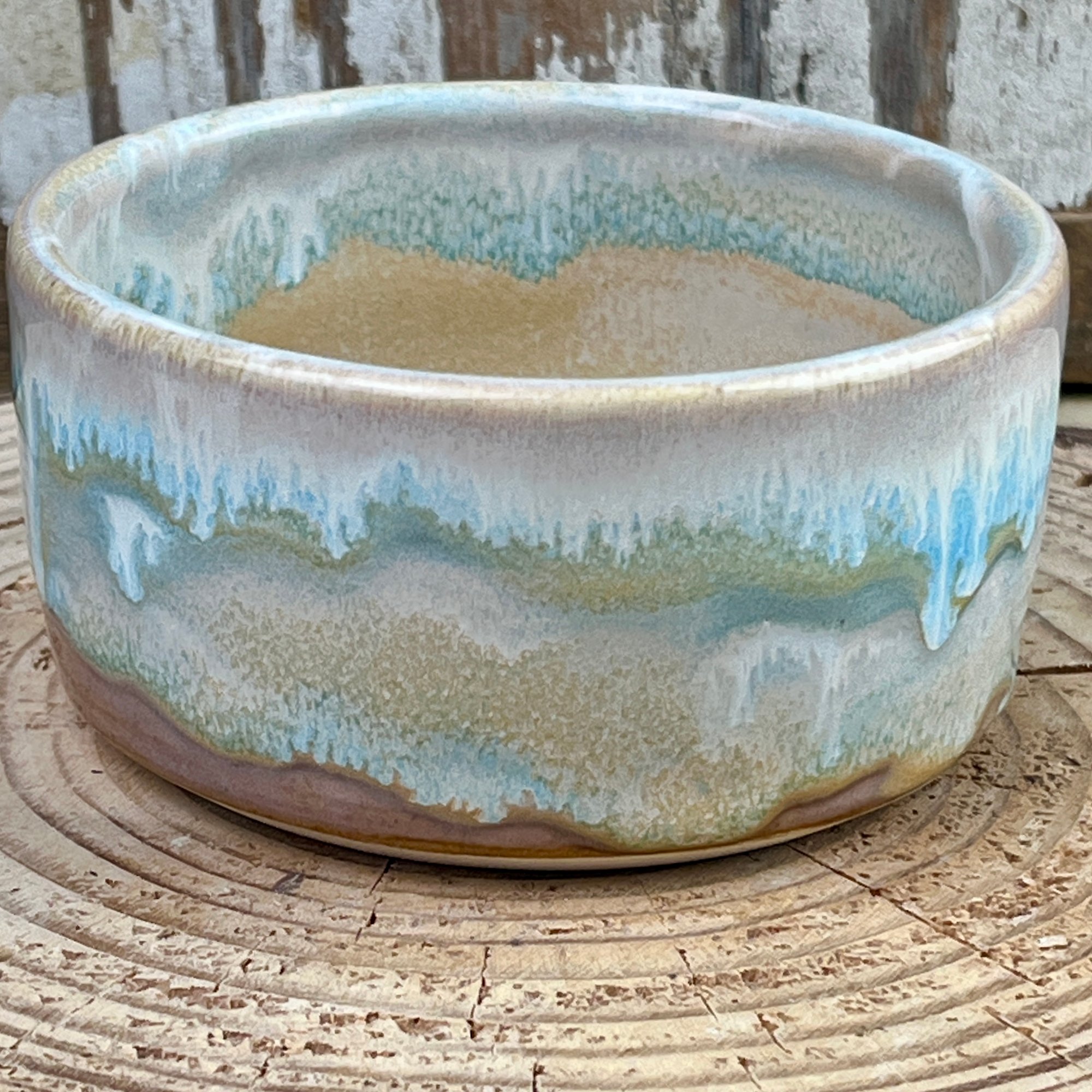 This beautiful bowl was thrown on the wheel and glazed using 3 different colors for a lovely layered effect. It holds approx 1 1/2 cups of liquid. The dimensions are 2" deep x 5" wide. It is microwave safe and can be placed on the top shelf in the dishwasher.